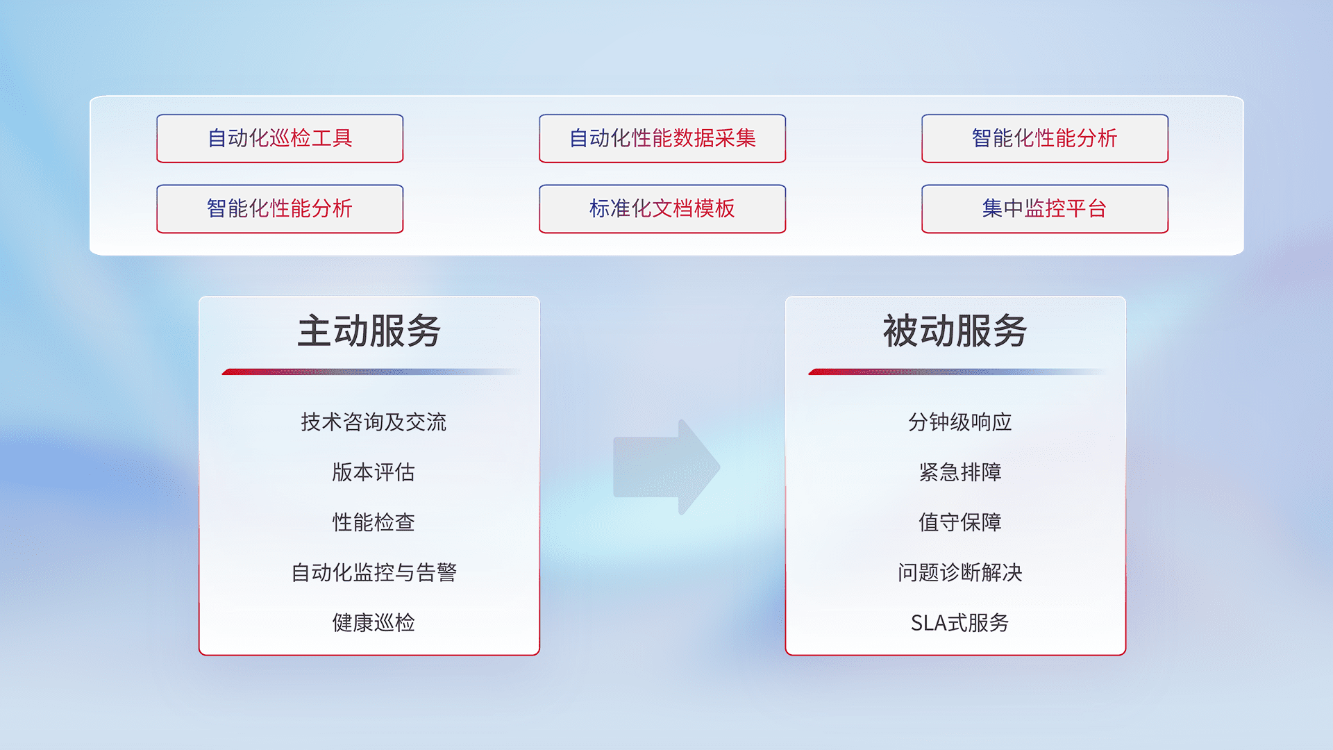 智能化工具和标准化文档,,,保障服务质量,,,提供主动服务(包含技术咨询、、、、版本评估、、、、性能检查、、、、自动化监控与告警、、健康巡检)和被动服务包含(分钟级响应、、、紧急排障、、、、值守保障、、问题诊断解决、、、SLA服务)。。。。